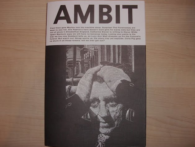 Dr. Martin Bax founded Ambit Magazine in 1959 in London. Martin’s inspiration was the writer John Middleton Murray, who ran a magazine from 1910 called Rhythm and whose contributors included Katherine Mansfield and D.H. Lawrence, with visuals contributed by Picasso and Miro. The first Ambit was set on a Variotyper machine. As an eminent pediatrician, Martin published huge medical tomes at the Lavenham Press and so they were always willing to extend a little credit on the printing bill when necessary, an essential for a small literary arts magazine. Over the years, Ambit has published many well know names. J.G. Ballard was the fiction editor for a while. Peter Porter, Carol Anne Duffy, Ralph Steadman, David Hockney have all made appearances, mostly at the beginnings of their careers. Mike Foreman was the art editor until he retired last year.