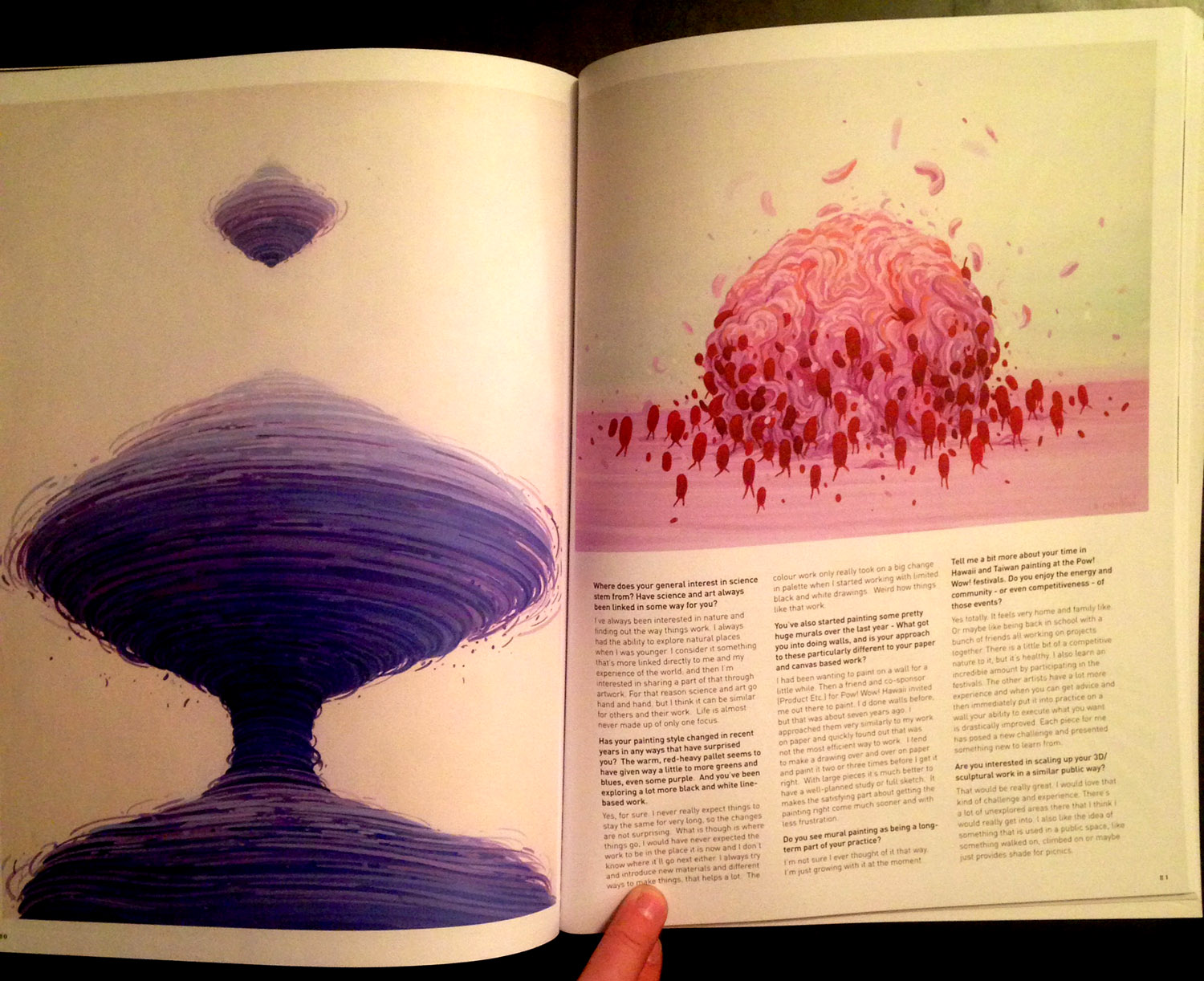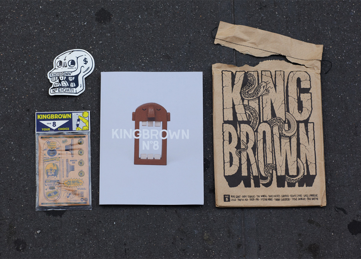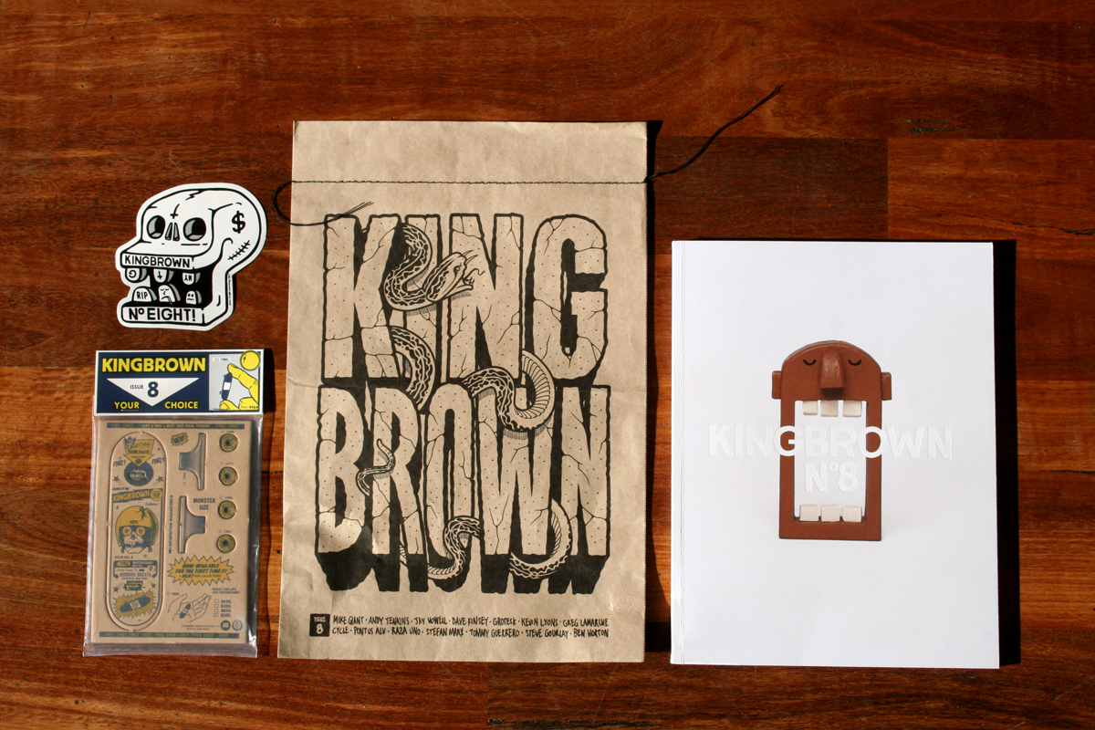 Inside Kingbrown you will find profiles and interviews that take you on a journey inside the studios and minds of internationally renowned contemporary artists. Printed with quality in mind, each edition is a collectable item, sealed and packaged in a brown bag with cool inserts. That’s pretty much the blurb from our website. It all really started when my friend Yok and I went to University together and one night at a house party we talked about how it would be cool to start a magazine. Then we got drunk. A couple of days later we made the time to chat about it more seriously – like the format, style, title, and how we would source funding. We didn’t know much about publishing back then, but we were educated in design, advertising and print. We felt Kingbrown was needed to represent a mix of quality Australian artists alongside the big-name internationals. We’ve learnt plenty of things along the way like brewing beer, holding big launch parties and traveling tax breaks.