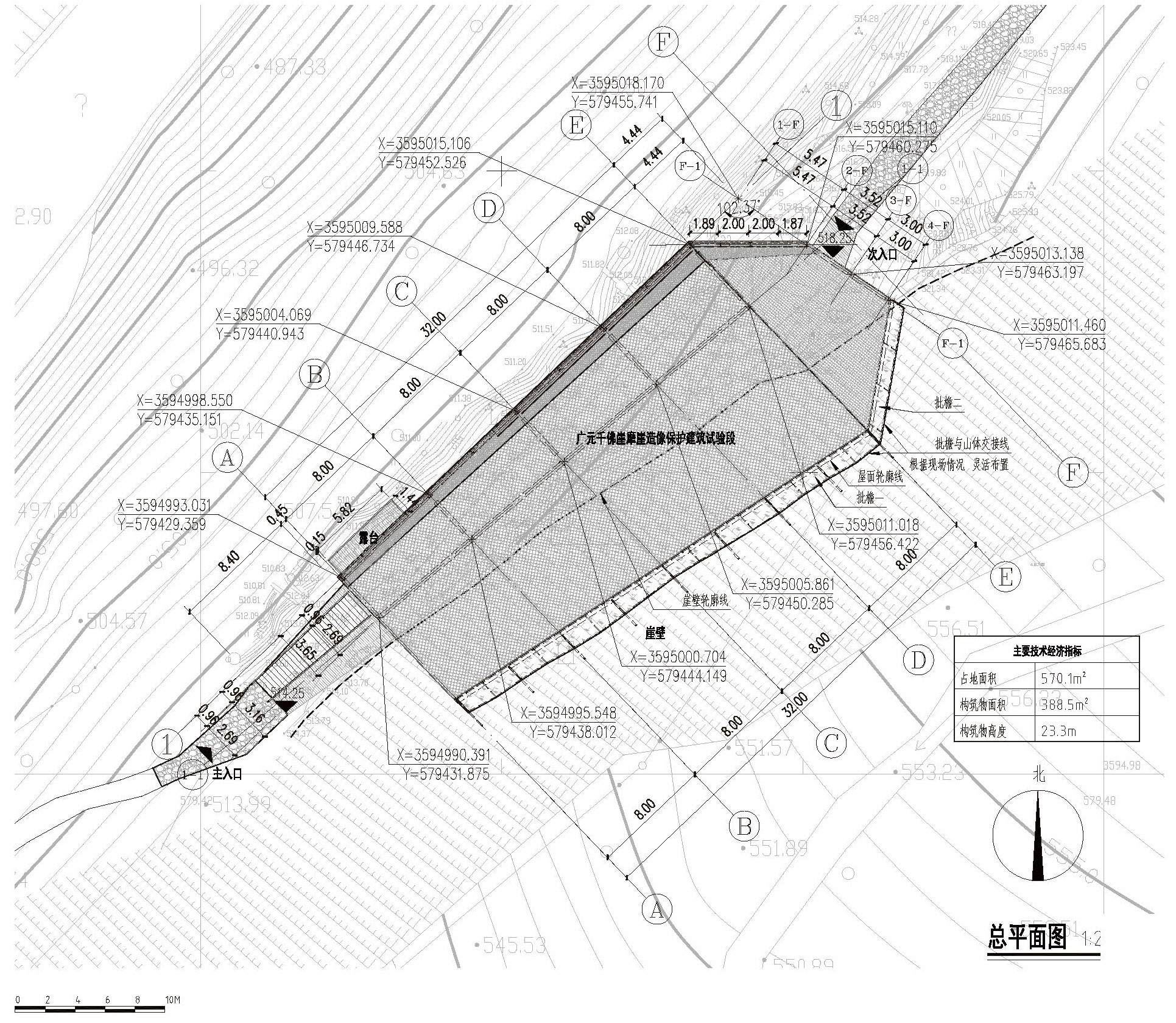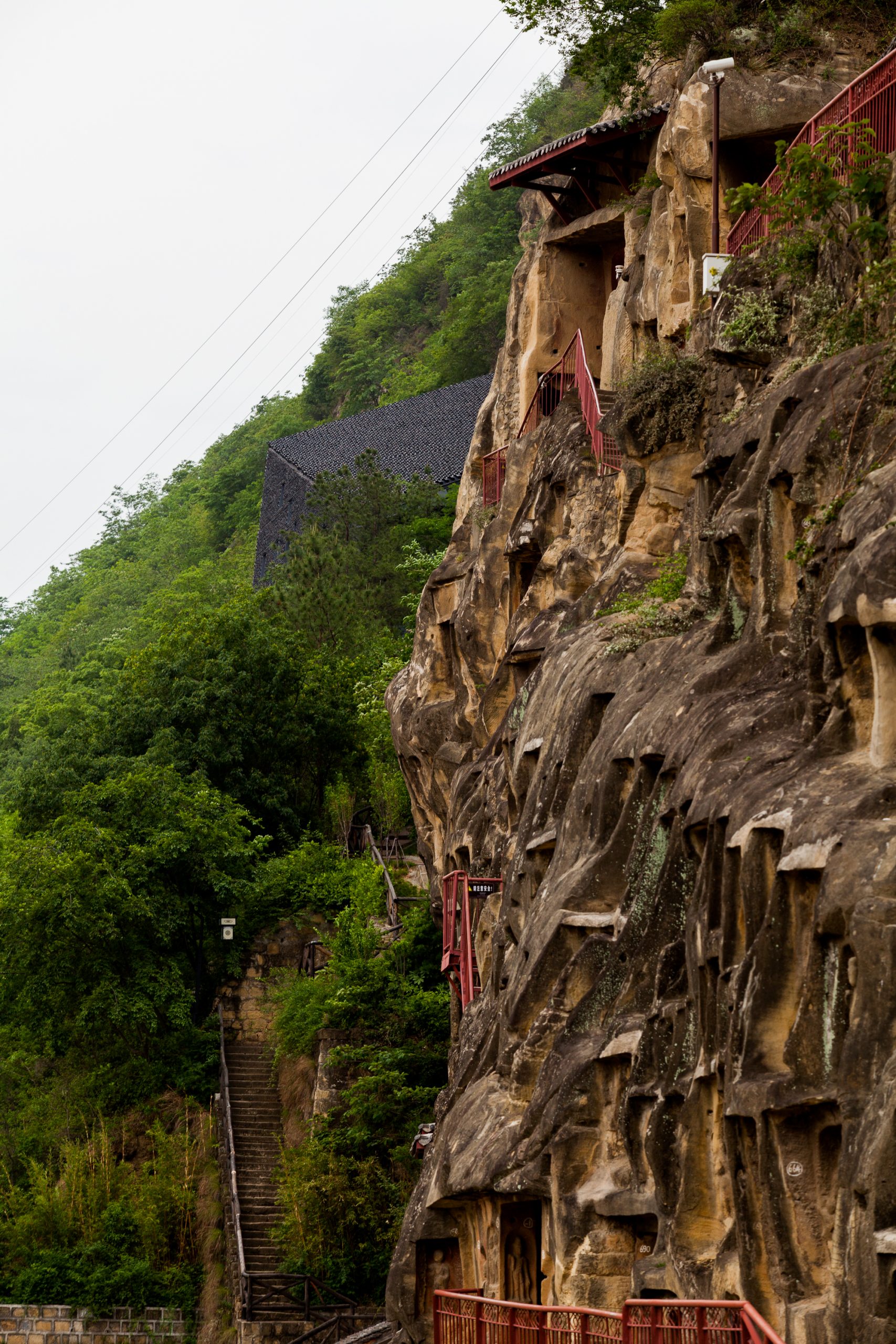 The 23 caves and niches on the north end of the cliff covered by the experimental conservational structure are 36 meters high above the Jialing River. The site area is only 410 m2. The local climate is typical in northern Sichuan Province, with plenty rain in summer, strong wind passing through the riverside in winter, and sufficient sunlight during the whole year, all to the disadvantage of the conservation.