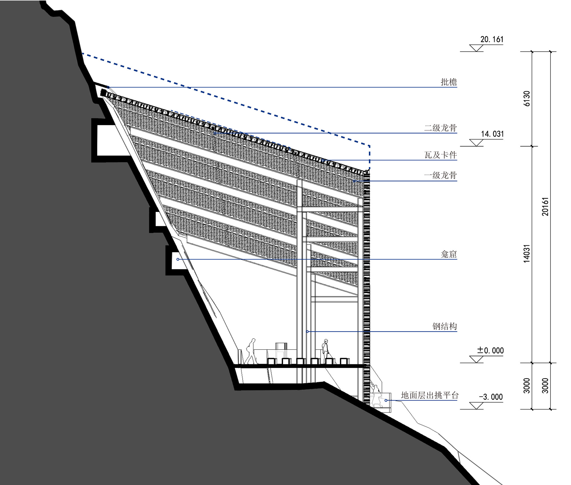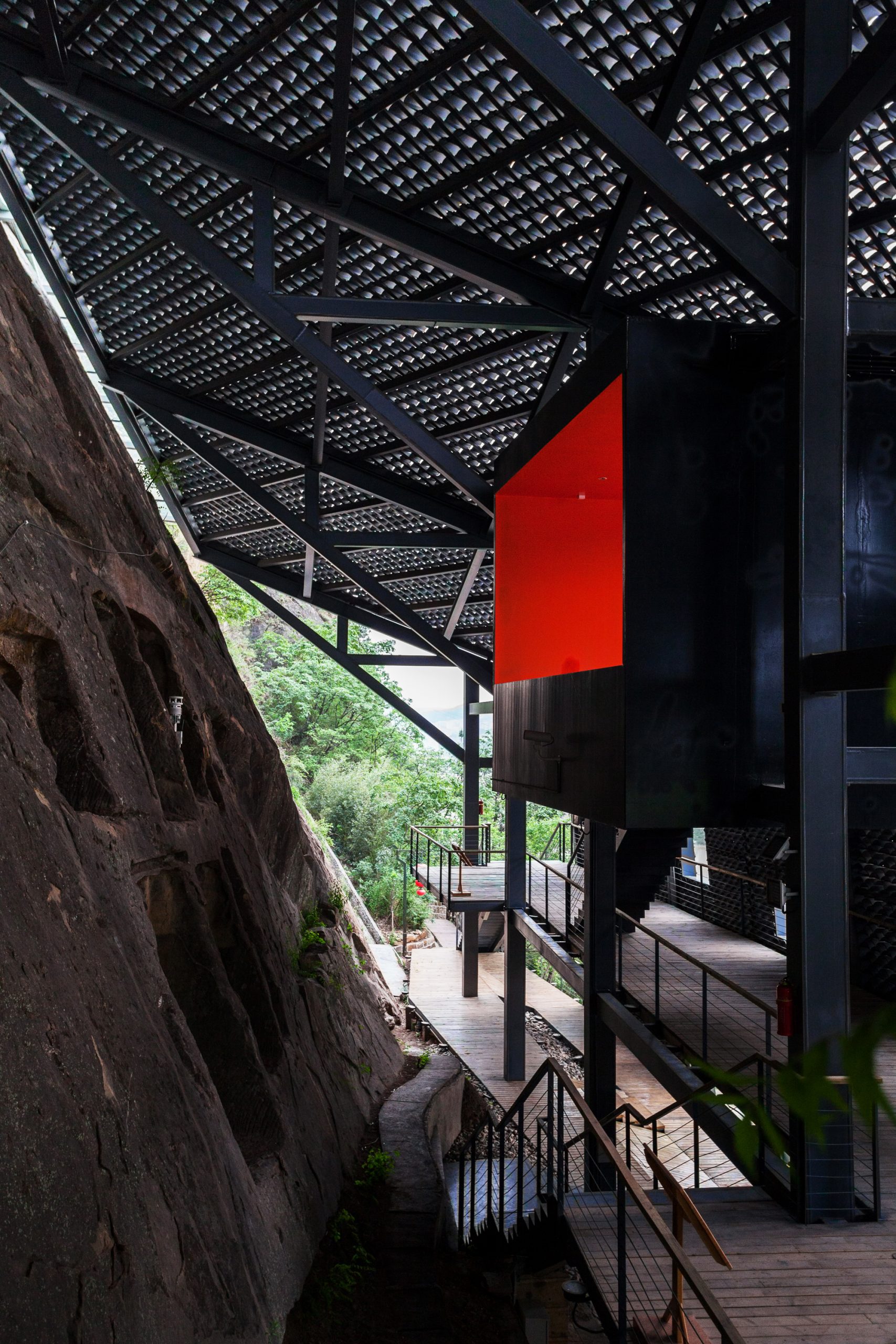 The structure is rooted in a platform on the cliff as to minimally interfere the cultural properties, and a cantilever system is constructed to support the protective shelter and keep it away from the cliff. As the same time, to minimize the disturbance to the cliff during construction, the 18m deep manual excavated piles were adopted as the foundation of the cantilever.