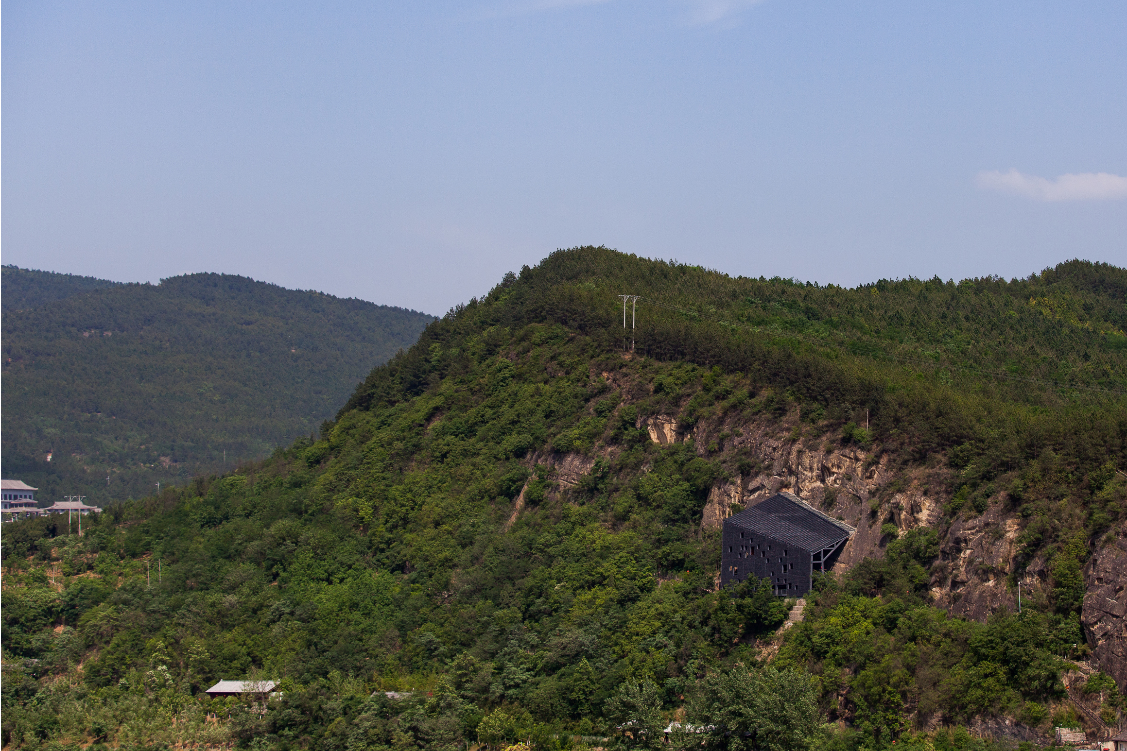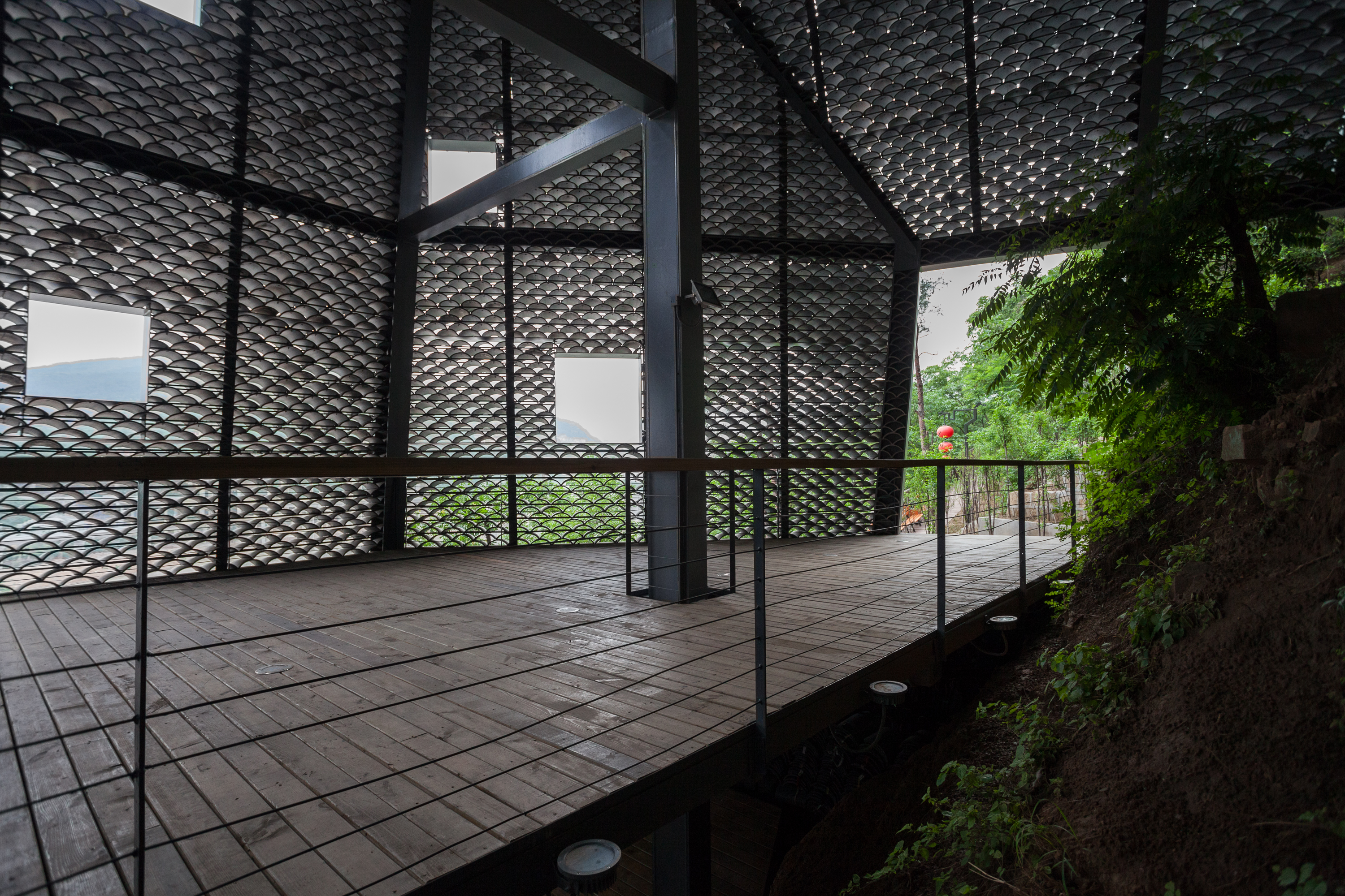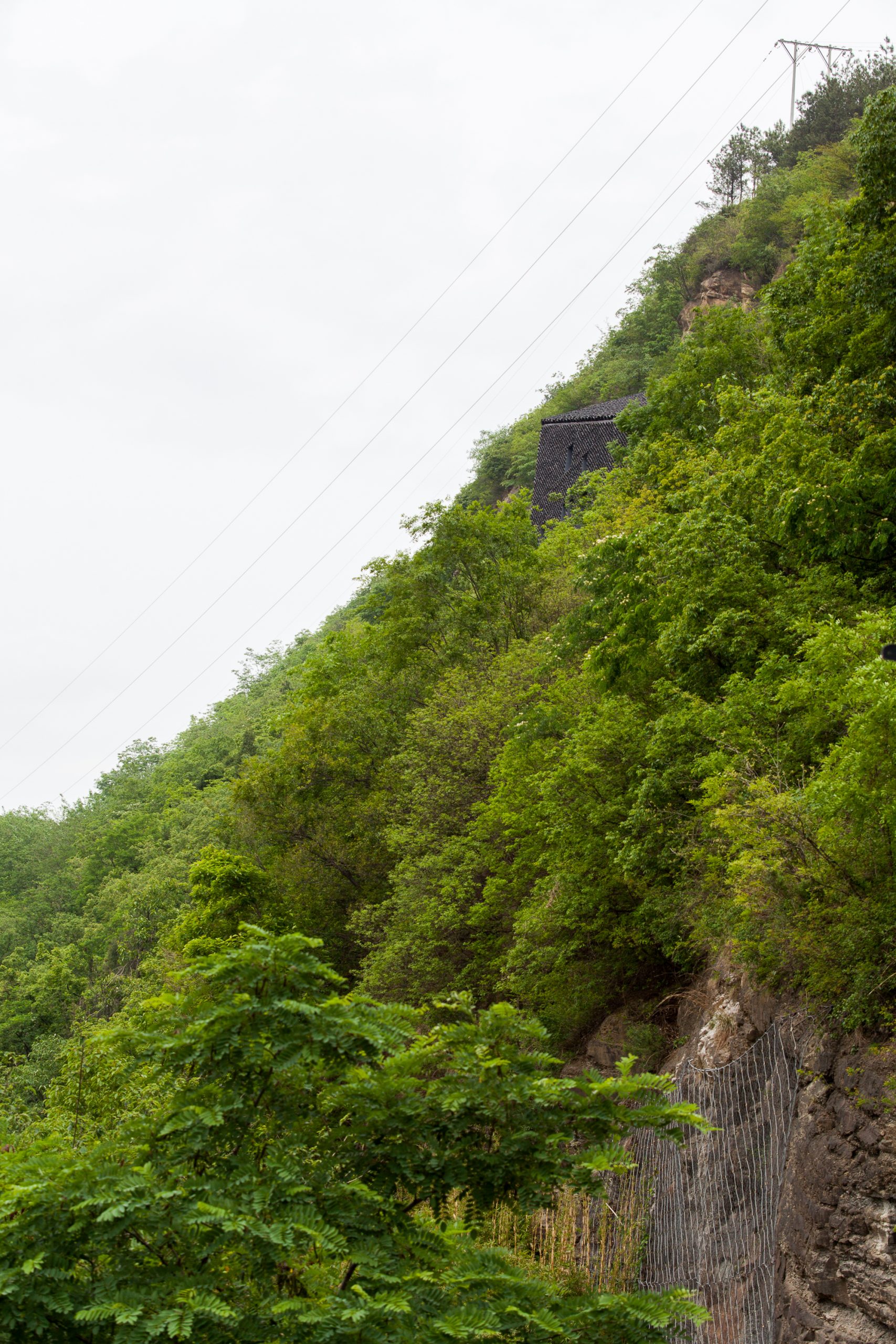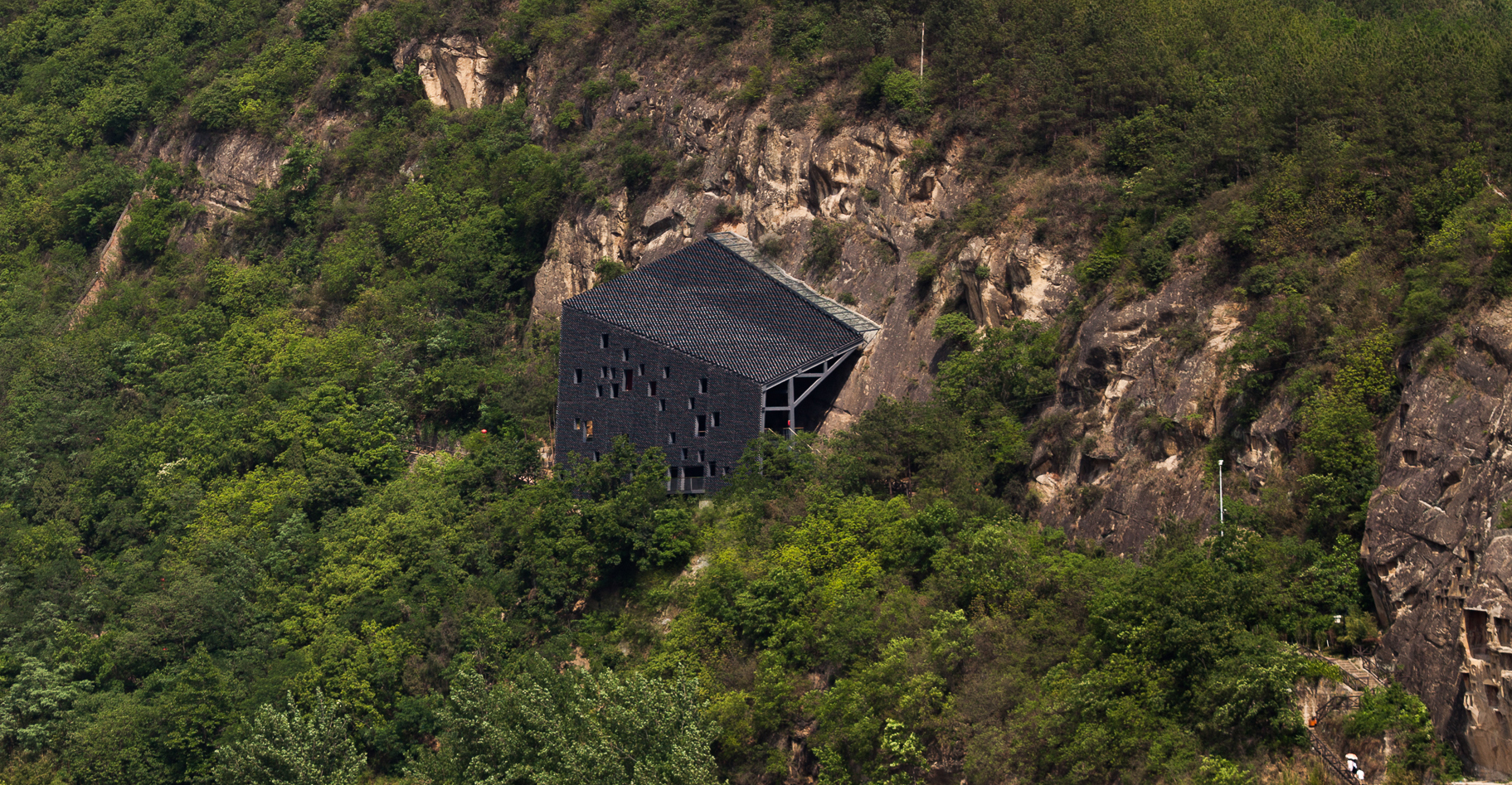 The gray tiles as common local materials are widely used in the project as one of the major materials both on the walls and the roof. Its color is similar to that of the cliff and easy to blend into the immediate environment. Besides, with the time flies and under the local climatic conditions, moss would appear on those tiles, which would further integrate the building into its context and would bring a sense of organic growth to it.