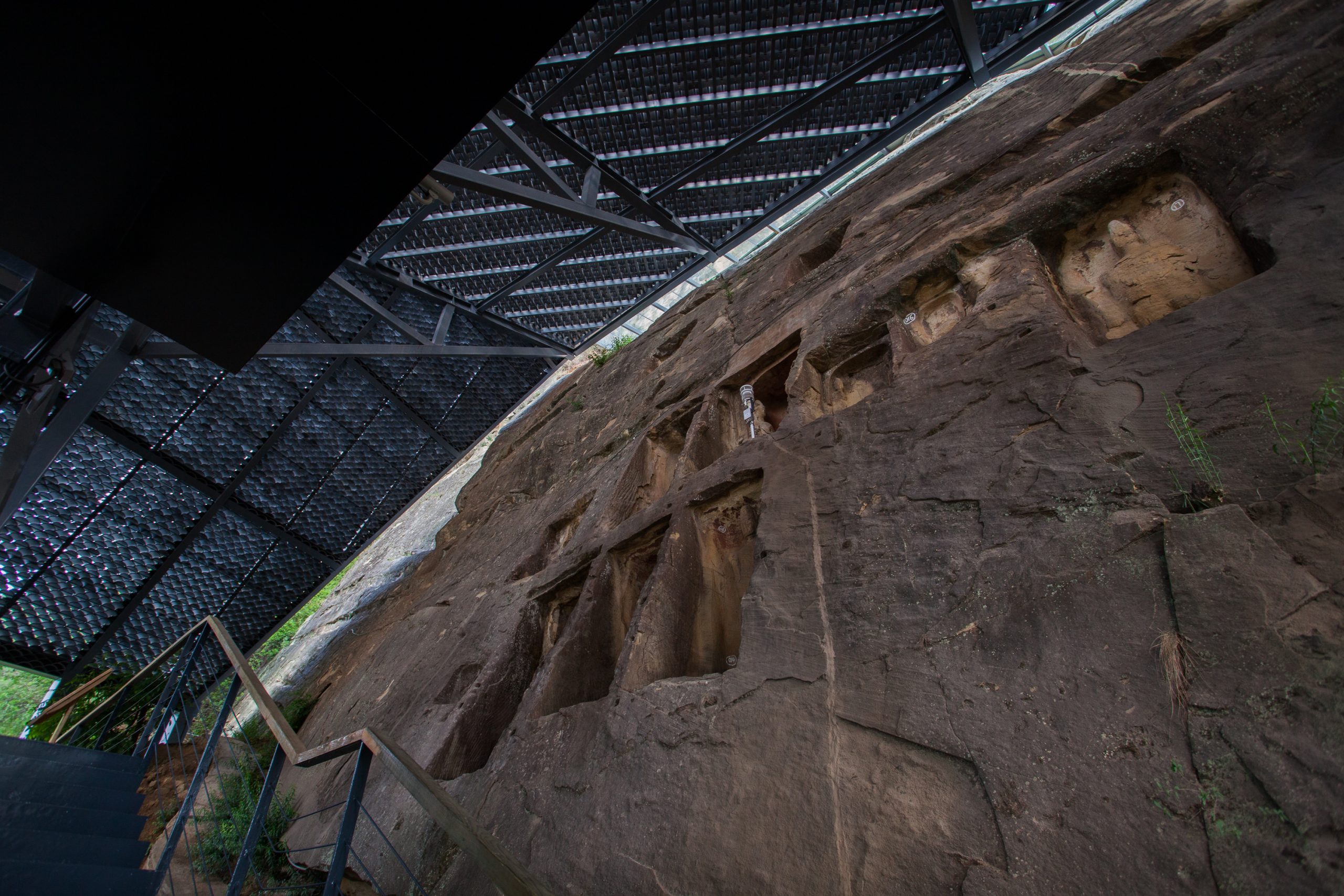 Qianfoya Cliff Inscriptions in Guangyuan, Sichuan Province date back to about 1700 years ago in North Wei Dynasty (4th Cn. AD). Due to their severe deterioration, the National Administration of Cultural Heritage firstly approved an experimental project of conservation architecture to protect a small portion of the inscriptions in 2014, the aim of which was to explore an effective method to prevent the grottos from erosion by wind and rain. The project has maintained the tradition of building shelters for the cliff inscriptions in Sichuan area, while the modern architectural technologies were applied, based on the analysis of the monitoring data, to create a protective physical environment for the ancient cliff inscriptions, and to be integrated into the landscape on site.