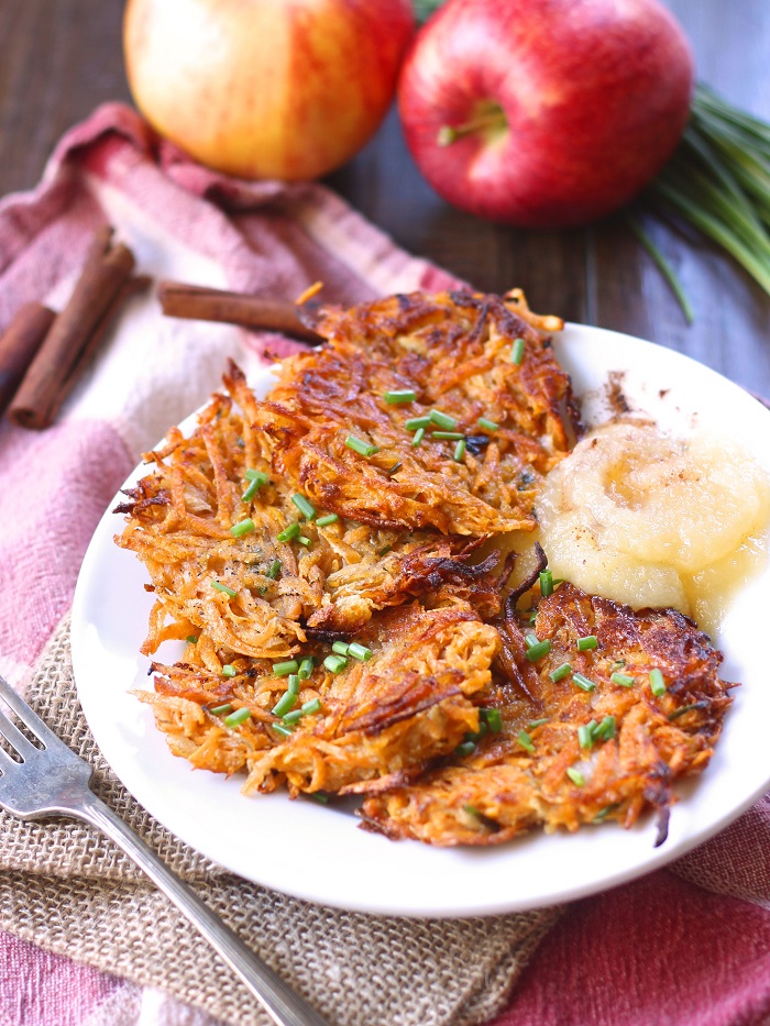 Sweet Potato Latkes with Spiked Apple Sauce via connoisseurusveg.com